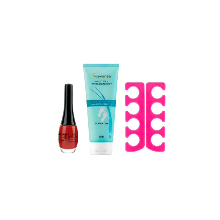 مجموعة العناية بالقدمين (كريم ترطيب و اصلاح باليوريا + فاصل الأصابع للصبغ + طلاء أظافر أحمر)